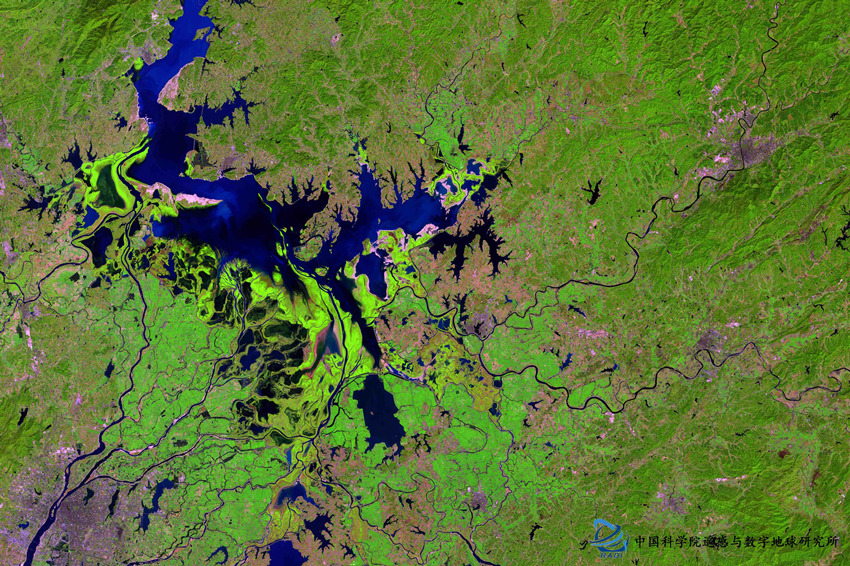 鄱陽湖位于江西省北部,是我國最大的淡水湖,由于長江改道和人類活動,大量的泥沙沉積在湖中,導致湖面不斷縮小,從影像上可清晰分辨出湖泊水域和沼澤區域。